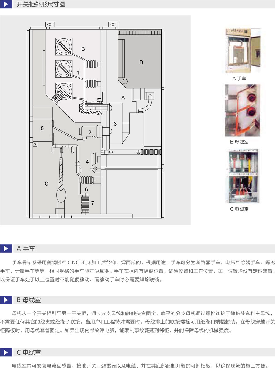 开关设备按GB3906-91中的铠装金属封闭开关设备而设计。整体是由柜体和中置式可抽出部件(即手车)两大部分组成(见图)。柜体分四个单独的隔室,外壳防护等级为IP4X,各小室间和断路器室门打开时等级为IP2X。具有架空进出线、电缆进出线及其它功能方案,经排列、组合后形成一-套完整的配电系统装置。本开关设备可以从正面进行安装、调试和维护,因此它可以背靠背、组成双重排列和靠墙安装,提高了开关设备的安全性、灵活性、减少了占地面积。