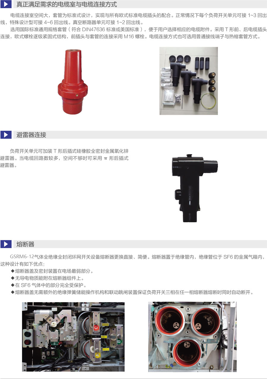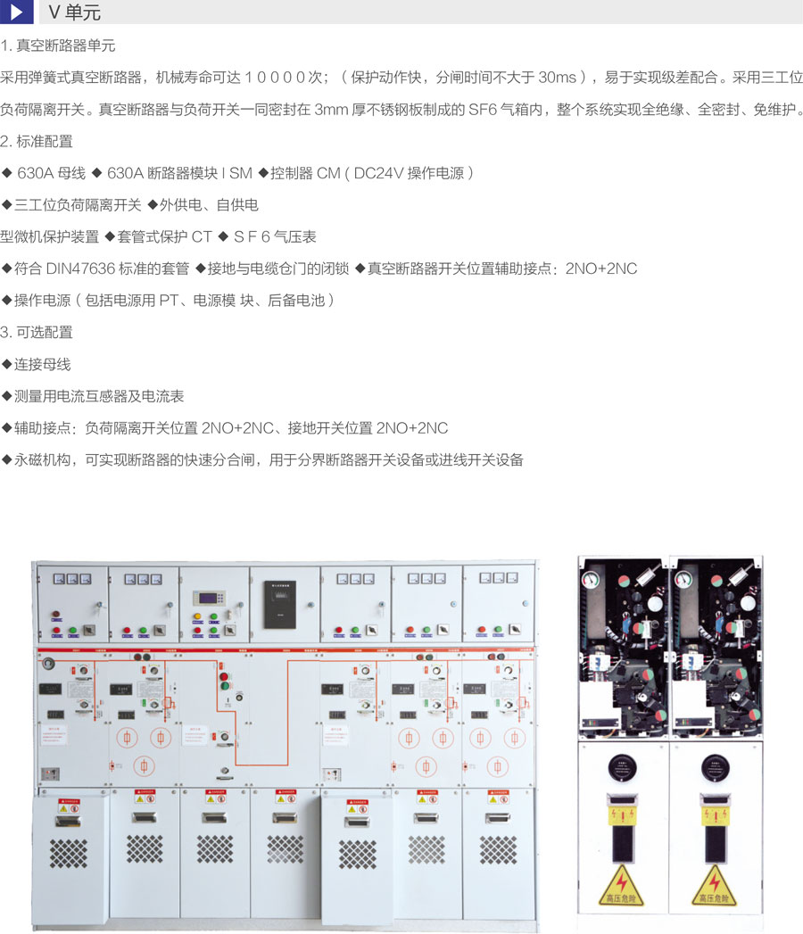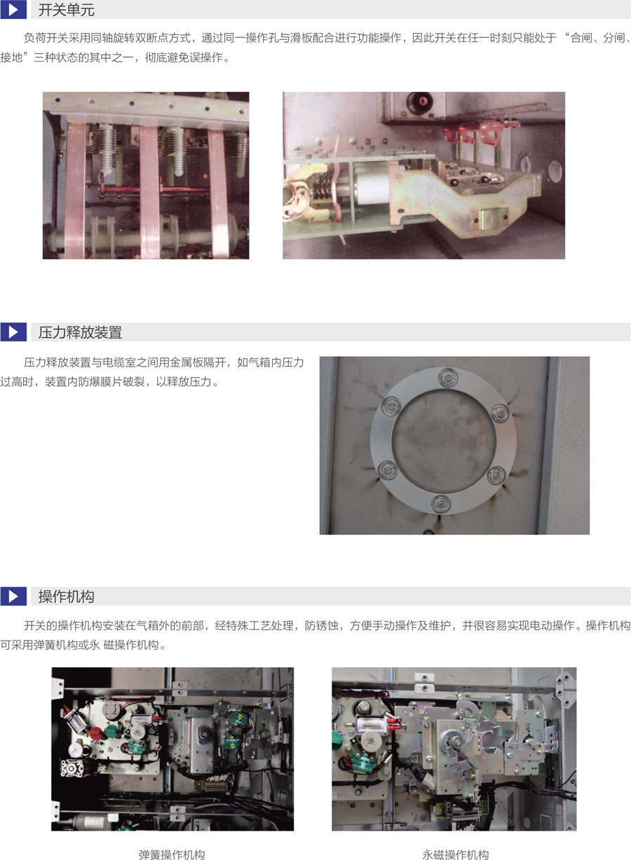 断路器采用负荷开关替代隔离开关,更安全可靠 ,一次侧全密闭设计提供意外接触的保护满足五防要求的机械联锁带电显示器可提供进出线路带电指示运行可靠:全密闭设计,所有10kV开关及母线带电体均密封在3mm不锈钢板焊接成的气箱中;配硅橡胶电缆插头,实现电缆头全绝缘全密封,从而不受灰尘、潮湿、小动物等外界环境影响弹簧储能操作机构,可人工或电动操作面板模拟线图提供开关位置指示柜体用镀锌板制作,表面静电喷涂,增强抗腐蚀性能压力表监视箱体内SF6气体安全压力范围。