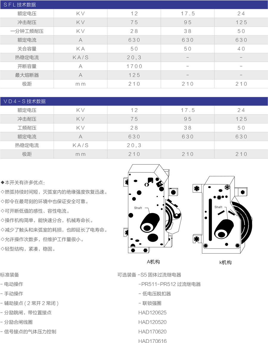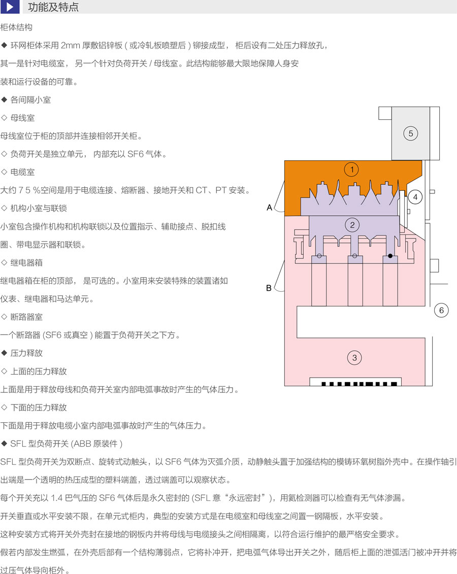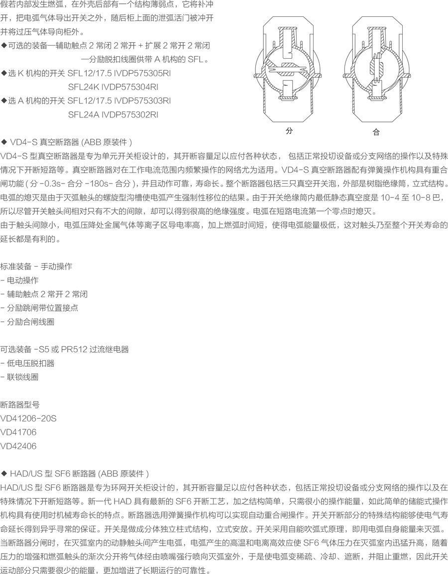 环网柜的主开关、操作机构及元器件采用A B B公司原装件或采用进口部件国内组装生产的SFL-12/24型开关设备,也可根据用户需要配装公司原装HAD/US型SF6。断路器或VD4-S型真空断路器。其操作方式分为动、电动两种。